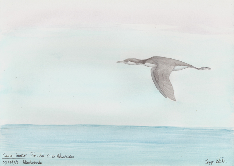 Captar bien el "carácter" o impresión o jizz siempre ha sido y cada vez una pequeña obsesión para mí, algo que creo que solo se consigue haciendo muchas horas de campo y viendo muchos pájaros. Aunque son prácticamente monocolores, la silueta tan característica de los colimbos en vuelo, las formas, volúmenes, las curvas de estas aves las hacen sutilmente difíciles de representar, me queda aún mucho por practicar y probablemente nunca será suficiente.
